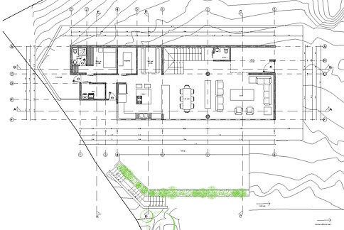 El primero a nivel de calle para estacionamiento y bodega y el segundo a un nivel intermedio donde se emplaza la vivienda, se proyecta una losa la cual permite un espacio exterior amplio y con dominio visual, el cual se relaciona tanto con el interior de la obra como con el paisaje lejano, las circulaciones interiores se ubican hacia la fachada mas desfavorable en cuanto al asoleamiento, por lo tanto se desplazan generando primero un vacío que recibe y le da prestancia al acceso, y segundo la circulación vertical, en ambos casos los espacios quedan cualificados por entradas superiores que insinúan el recorrido de la obra.